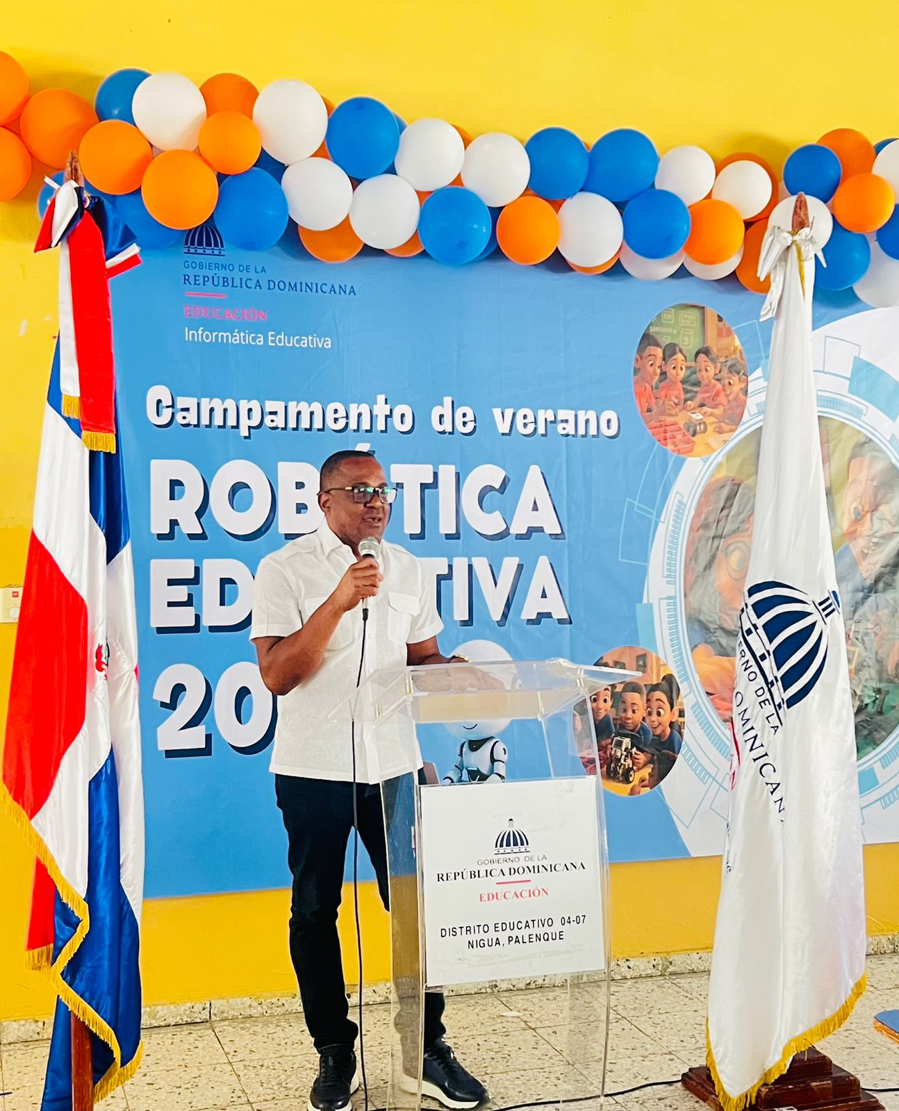 El alcalde Jorge Ortiz Carela acompañó la apertura del Campamento de Verano “Aprender es Divertido” y “Robótica Educativa”, realizado en el Centro Educativo Juan María de Jesús Villanueva, ubicado en Boca de Nigua, San Cristóbal.